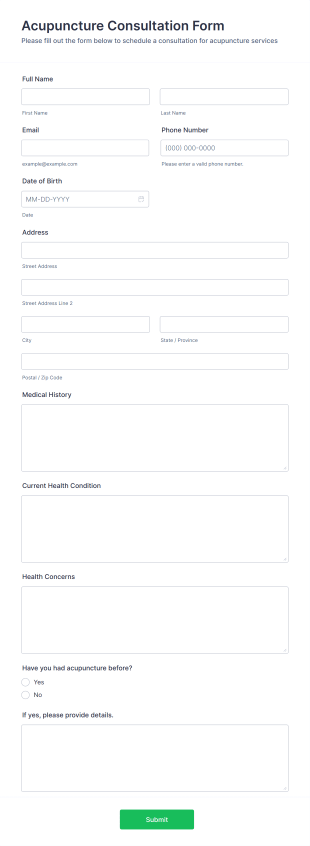 The Acupuncture Intake Assistant is a friendly virtual assistant designed to enhance the acupuncture service experience by streamlining the consultation process. This AI Agent collects crucial client information, including medical history, health conditions, and personal preferences, all through an engaging conversational interface that improves client interactions and simplifies data collection. With Jotform’s AI Agents, acupuncture clinics can create interactive assistants that boost client engagement and optimize appointment scheduling, solving the challenges of information gathering in a user-friendly manner.