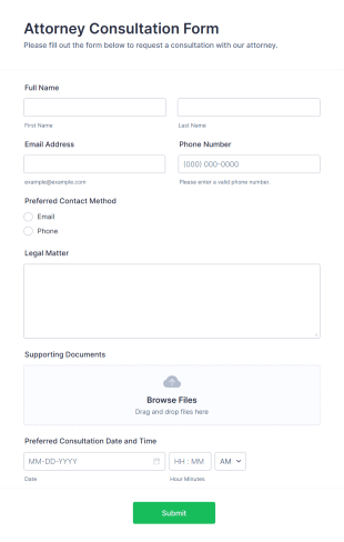 The Attorney Consultation AI Agent allows legal practices to collect a wide range of data, including client names, contact details, preferred contact methods, and specific legal issues. It can also request supporting documents, ensuring that attorneys have all necessary information before consultations. With Jotform's customization options, the agent can be tailored to reflect the firm’s branding while maintaining a user-friendly interface. The ability to handle multiple forms enhances data collection across various legal services.