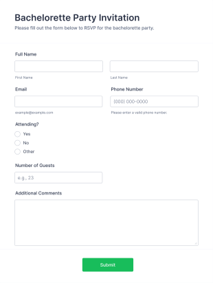 The Bachelorette Party Invitation AI Agent is a conversational assistant designed to streamline the RSVP process for bachelorette parties. This AI Agent collects essential guest information, including names, emails, phone numbers, attendance confirmation, and the number of guests, ensuring an organized and personalized invitation experience for the host.