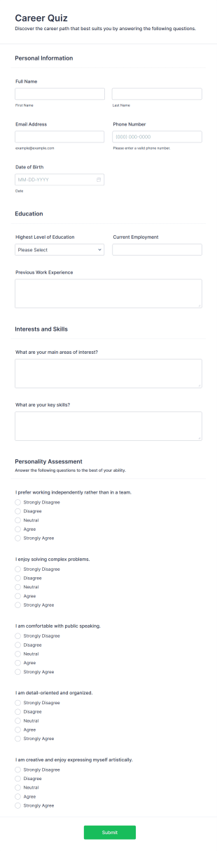 The Career Quiz AI Agent is an interactive assistant that helps individuals explore their ideal career paths through engaging questions. This AI Agent collects personal information, educational background, and skills in a conversational format, making the career exploration process both intuitive and personalized. It empowers participants by delivering tailored insights into their professional futures, enhancing the overall experience of career guidance.