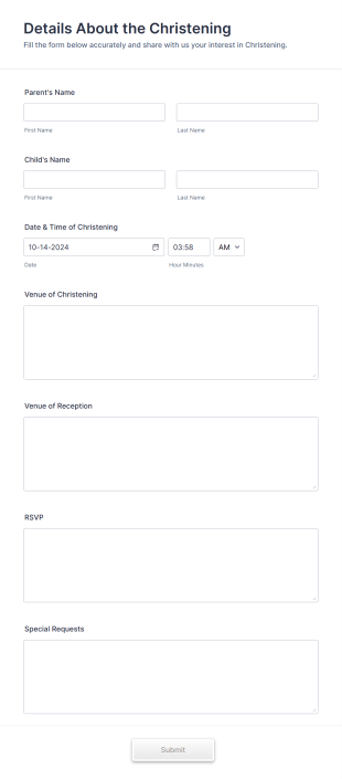 This AI Agent effectively collects a range of information, including parents' names, child's name, date and time of the christening, venue details, and RSVP responses. The conversational interface allows for dynamic interactions, enabling families to customize invitations while capturing essential data in a friendly manner. Additionally, the agent can be styled to match the theme of the christening, enhancing the overall experience for families and their guests.