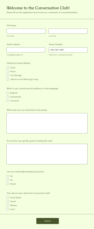 This AI Agent is crafted specifically to help streamline the registration process for individuals eager to join a vibrant community of conversationalists. By utilizing a conversational format, it not only makes the experience enjoyable but also ensures that all necessary details are captured effectively. This approach minimizes the chances of incomplete submissions and enhances engagement, making it easier for organizations to welcome new members.