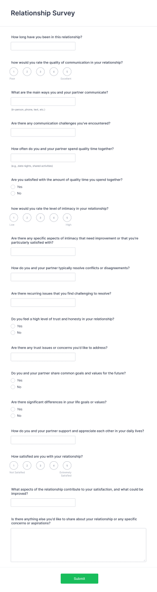 A Relationship Survey AI Agent is a conversational assistant designed to help couples explore their relationship dynamics through insightful questions. This AI Agent facilitates meaningful discussions, empowering partners to share experiences and enhancing their communication and intimacy in a supportive environment.