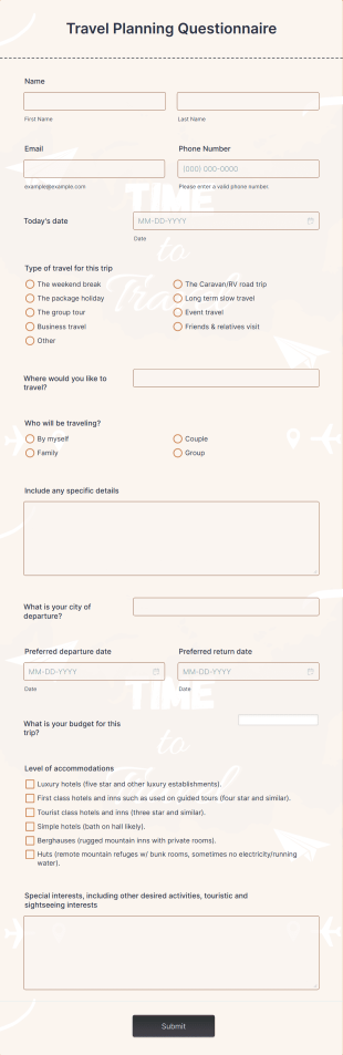 The Travel Planning AI Agent is an interactive assistant designed to streamline the travel planning process for individuals and families. This AI Agent captures essential details like travel preferences, dates, and budget through a conversational interface, making it easier for travelers to organize their trips efficiently and effectively. By utilizing Jotform’s AI Agents, travelers can enjoy a personalized and engaging experience while gathering vital information for their journeys.