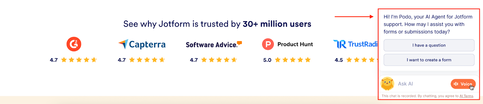 You’ll usually find a chatbot parked in the bottom-right corner of a website, like Podo on Jotform’s website: