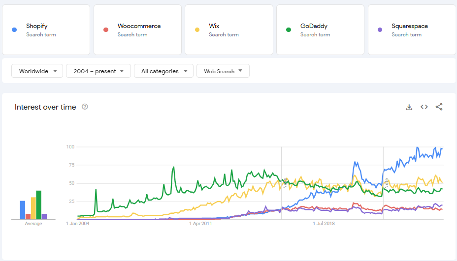 - Shopify is by far the most searched e-commerce solution. This is impressive, since Shopify (and WooCommerce) are the only solutions that are e-commerce-only tools. See the Google Trends graph below. Even GoDaddy searches dropped as Shopify’s increased, and GoDaddy does a lot outside of e-com.