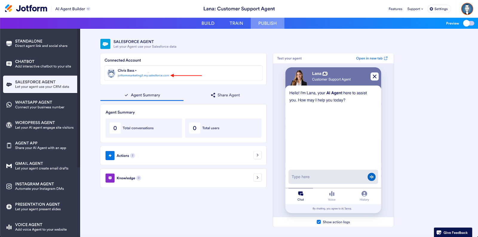 Once you’ve selected your use case, it’s time to review your configuration and test your agent. On this screen, you’ll see your connected account. When you click on it, you’ll be redirected to your Salesforce instance.