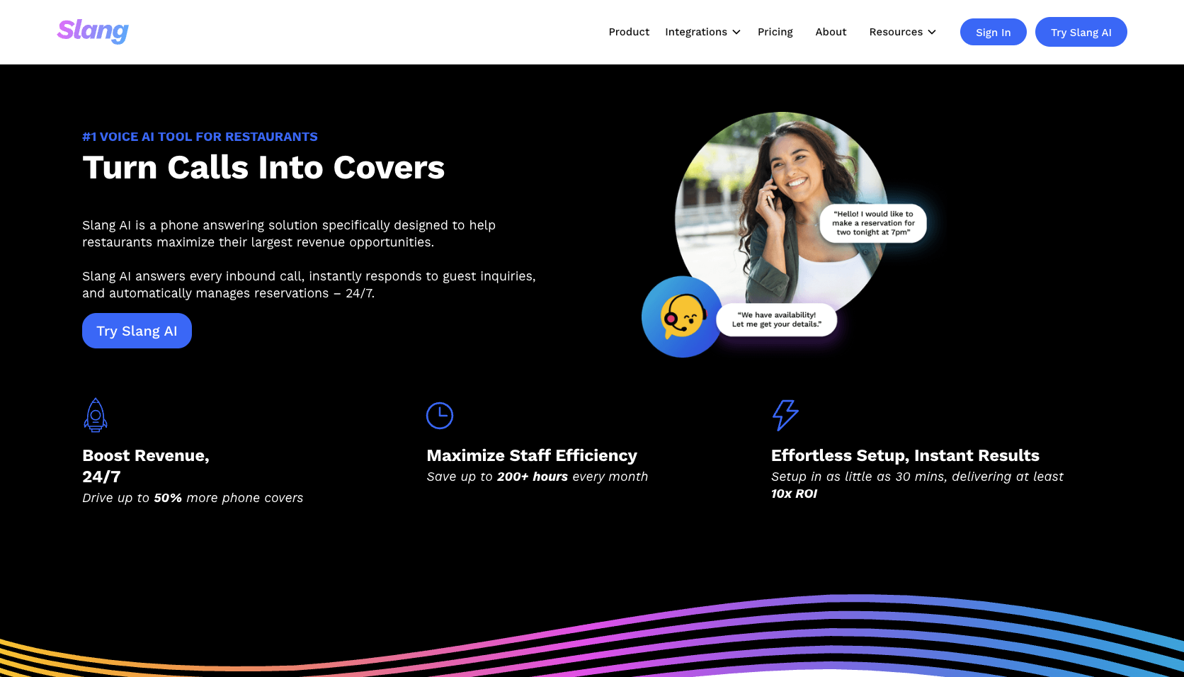 Built exclusively for restaurants, Slang helps free up staff time on the phone and convert calls into customers for restaurants of all sizes, from one location to entire groups. Slang picks up every call instantly and its trainable AI can provide answers to commonly asked questions, list today’s menu, and set reservations.