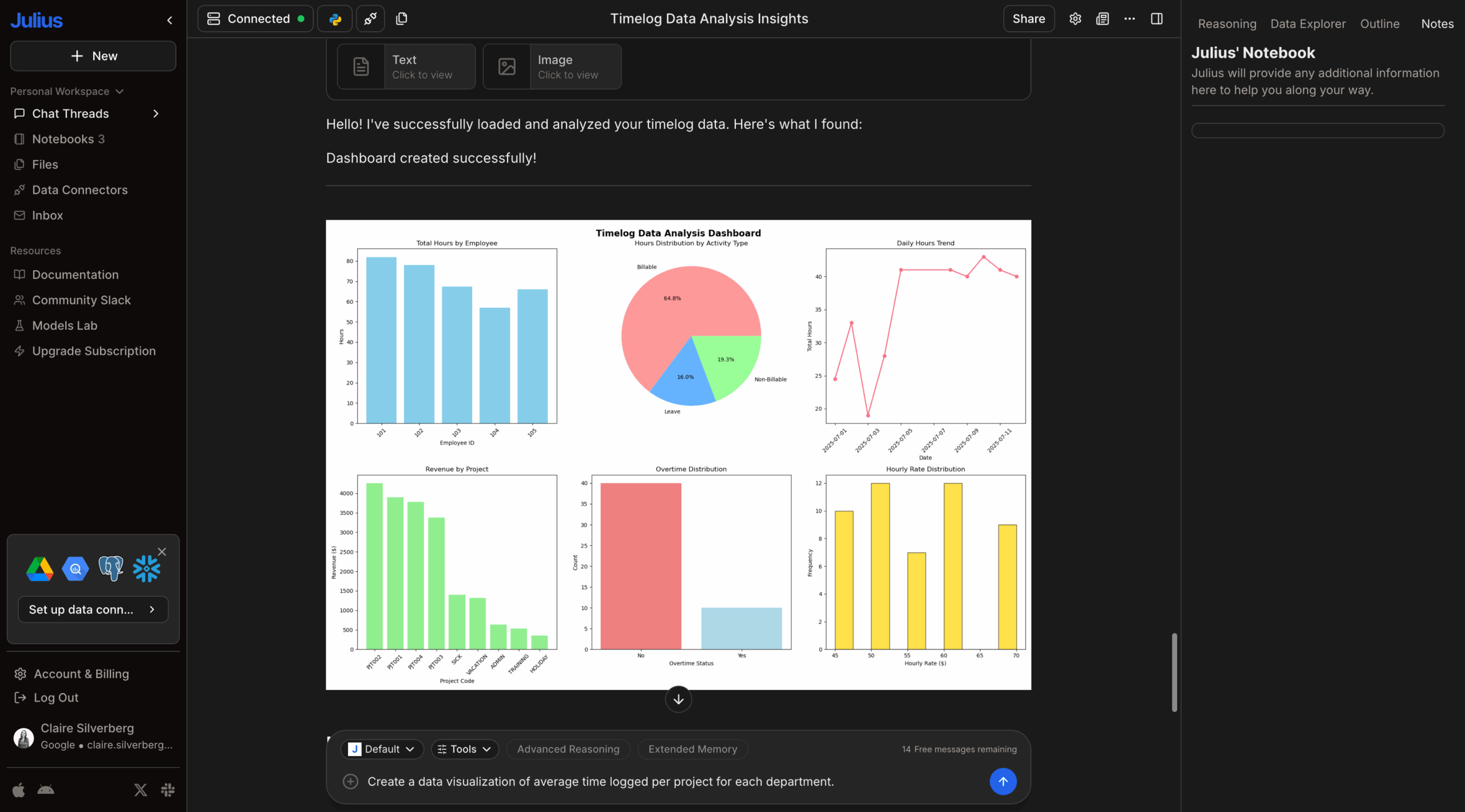 Julius is like a powerful AI data assistant that helps you analyze and visualize data through natural conversation. My favorite thing about Julius is that I could ask it questions, even without technical experience, and receive comprehensive answers complete with charts, graphs, and detailed explanations.