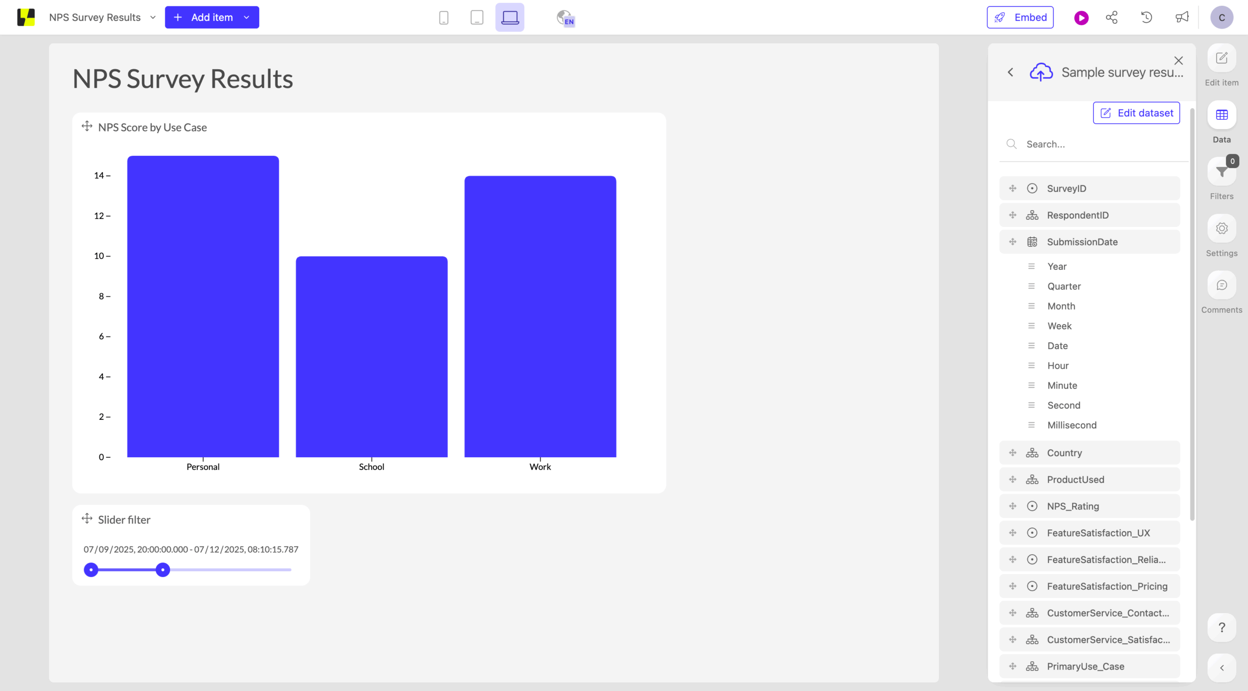 Luzmo was the most user-friendly dashboard and data visualization tool I tested. After playing around in the tool for a few minutes and following the startup tutorial, I was able to create a couple of different types of graphs and add dynamic variables that allowed me to see directly how different factors affected my dataset.