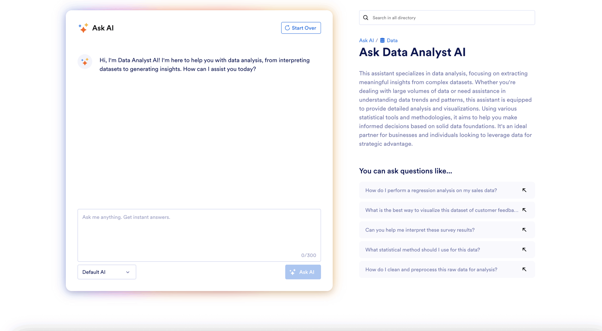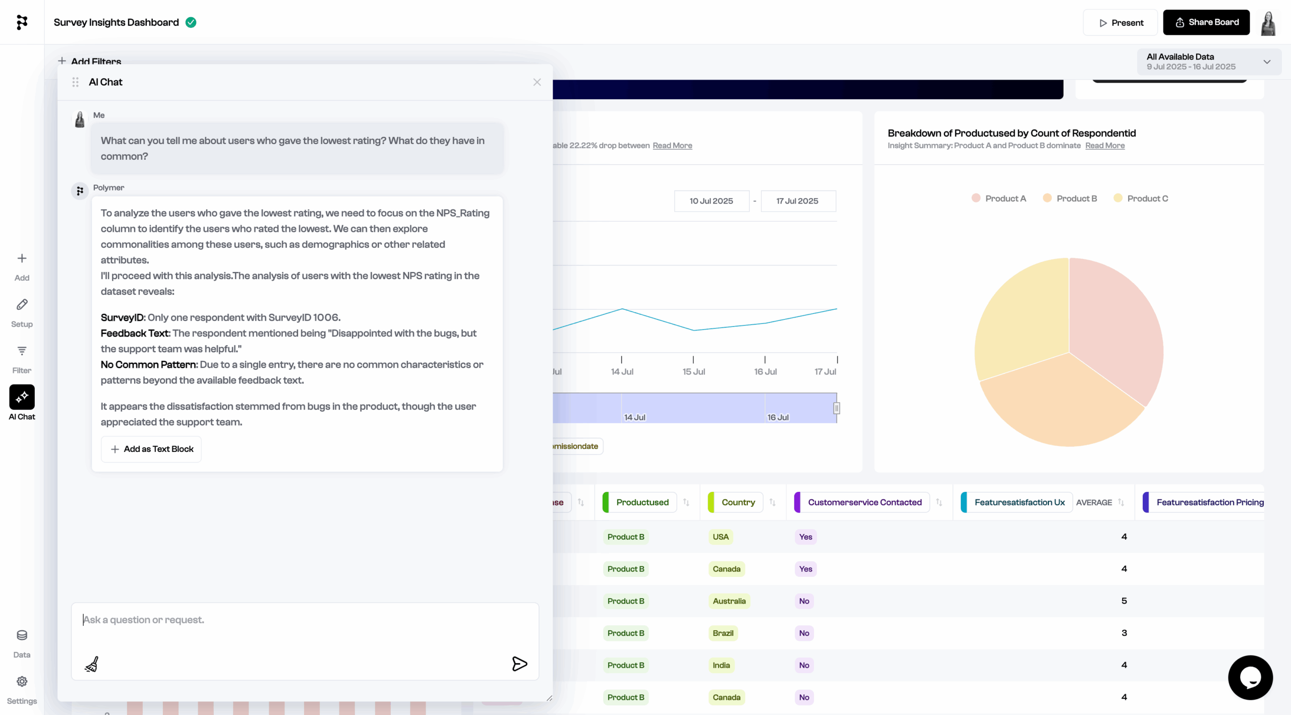 The platform’s algorithms work behind the scenes of its easy interface to identify trends, outliers, and relationships within your data, then automatically generate relevant visualizations and insights. I was impressed that the AI chat could not only answer my questions directly, but also give me a “why” and note its own limitations. However, it also needed some nudging and specific prompting to come up with insights I could use in real-world scenarios.