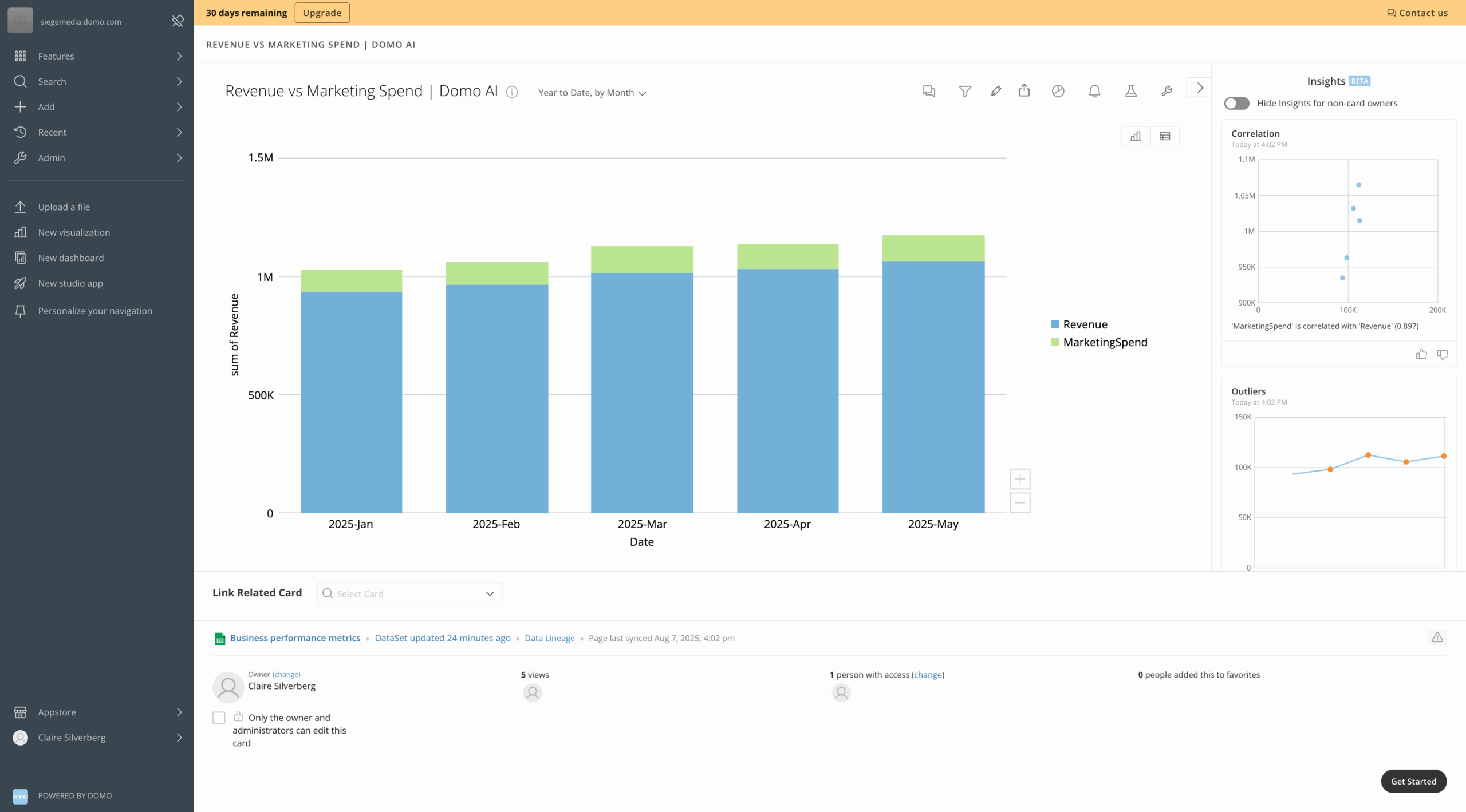 The platform supports users throughout the entire data lifecycle, from cleaning and modifying raw data to loading it into customizable data apps that make the tool work for your specific business needs. It took some getting used to the node-based interface, but once I became more familiar with Domo’s layout, it was fairly easy to create data visualizations.