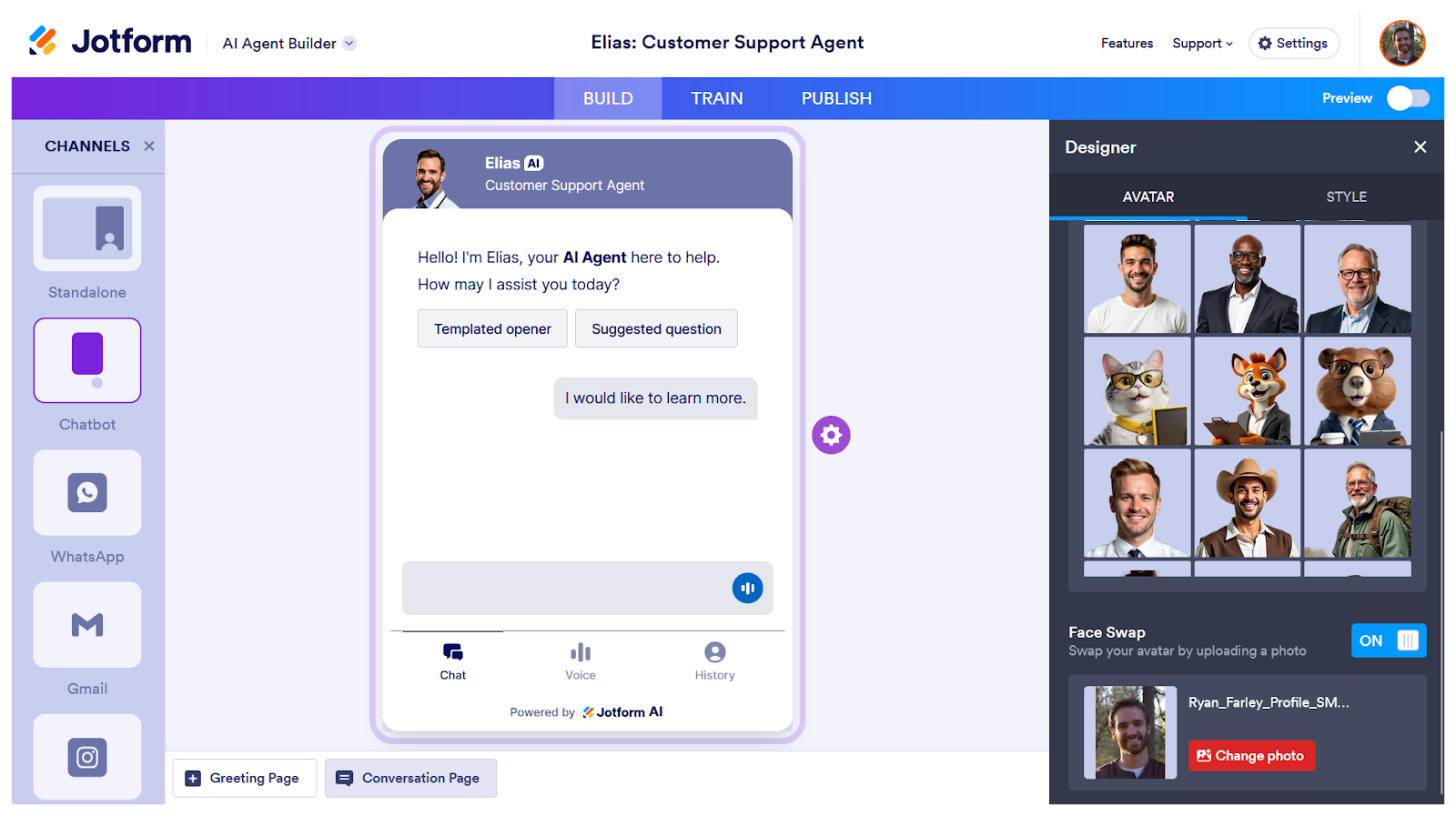 Putting a face on your chatbot makes conversations feel more personal and friendly, as long as the AI’s responses are up to par. Jotform excels at that as well, with several options for training your agent on your own data and letting users choose between text and voice responses.
