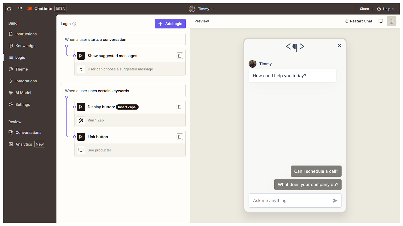 Training, customizing, and deploying one of Zapier’s chatbots is incredibly easy, without dumbing down too much of the design. You can add your logo to the top of the chat (and make it clickable), insert suggested conversation starters, and create action buttons triggered by certain keywords. What’s more, every element has its own size and color settings.