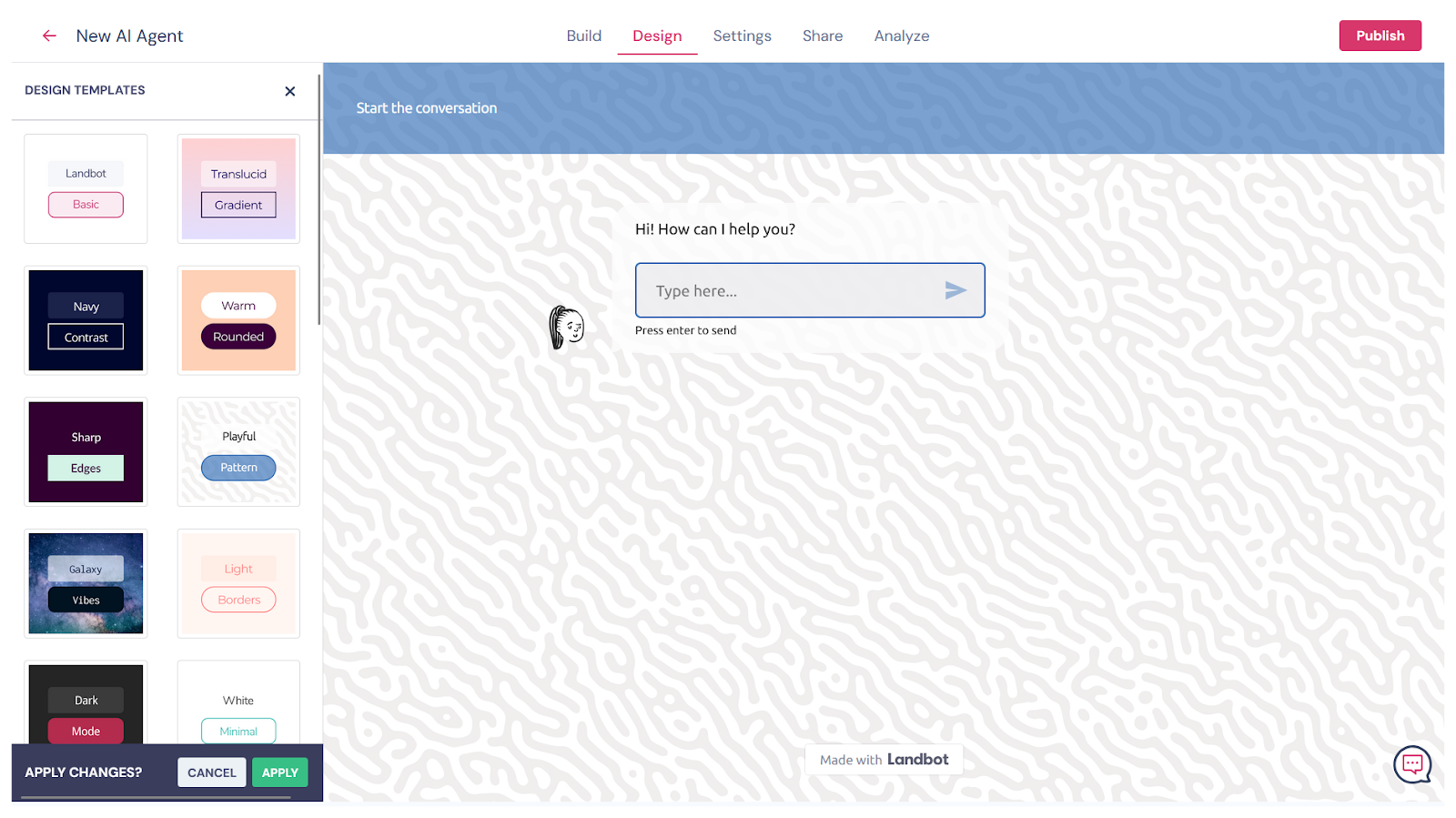 Landbot’s Design tab feels like Canva for AI agents. It’s packed with over two dozen pre-made templates, alongside configurations for virtually every visual element users see. You can even adjust your bot’s typing speed (in words per minute) to mimic natural human conversation. Despite the number of levers you can pull, every setting is intuitive and accessible, even for non-technical users.
