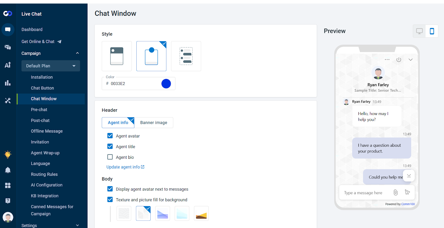As great as AI chat widgets are, it’s important to remember that their main purpose is to move visitors toward a goal, whether that’s purchasing something or closing a support ticket. Comm100 puts an emphasis on this with dedicated design tabs for Pre-chat and Post-chat. With the former you can require a form fill or CAPTCHA before starting a conversation and retain that information for later sessions. For post-chat settings, there are some nice options for prompting users to complete an NPS survey when the conversation ends.