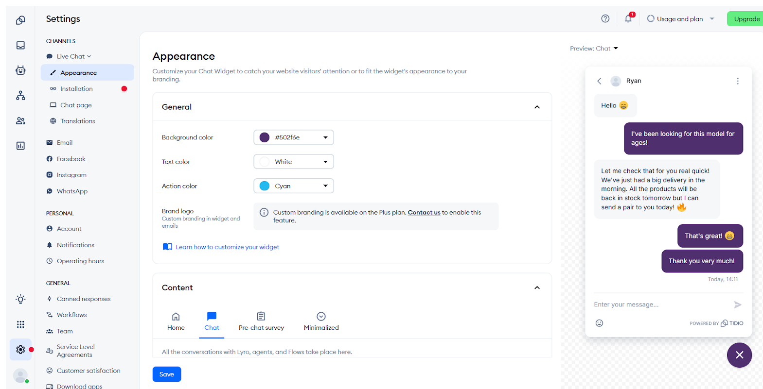 One of the things Tidio does to earn users’ trust is put human handoffs and chats front and center. There’s an entire settings page devoted to customizing those transitions, including handoff messages, destinations, and triggers. Regardless of whether it’s a human or an LLM writing the responses, though, users see the same welcoming interface.