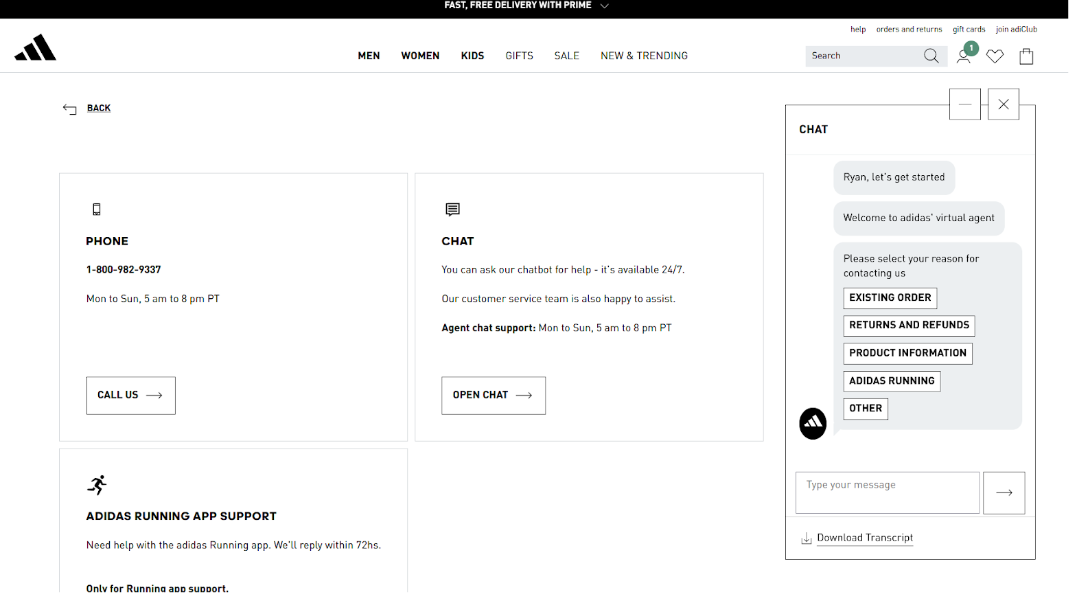 We’re not sure why the Adidas chatbot is buried on the company’s contact us page. It looks great on the page, remembers who you are and your past chats, and provides super quick answers.