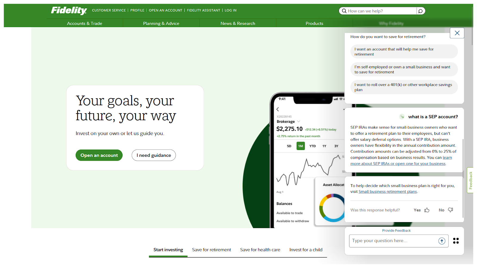 Fidelity puts its chatbot in the site’s main navigation, in one of the five prominent spots. Open it up and there’s a welcome message that explains how to use Fidelity Assistant as well as a few common opening questions. Everything makes sense right out of the gates and the design interface ensures that scanning through previous answers is much quicker than reading a single wall of text.