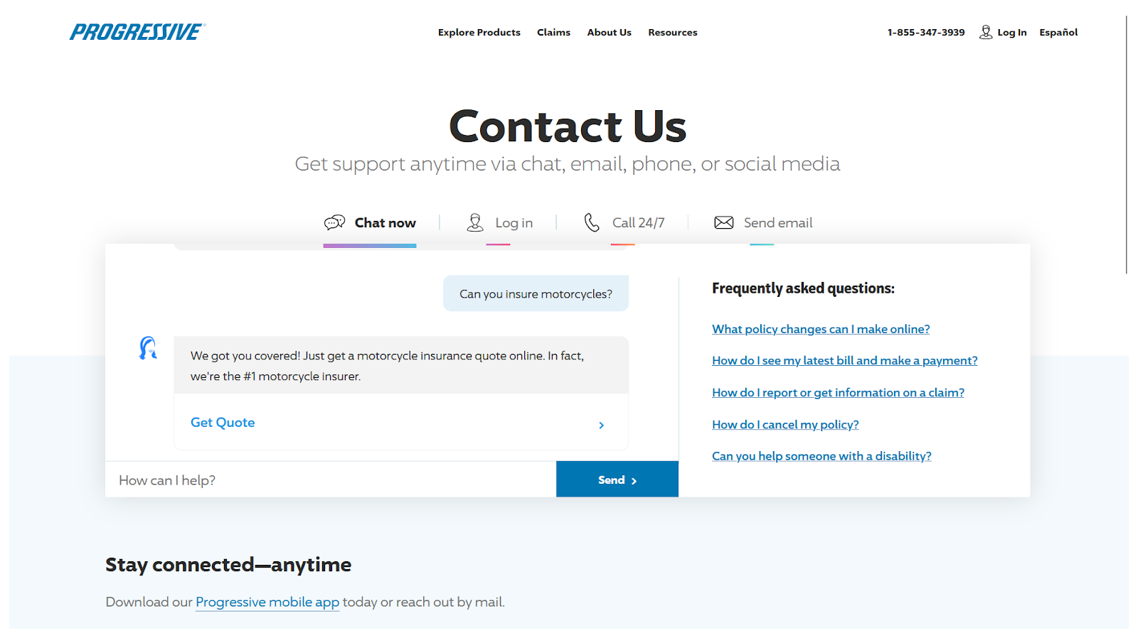 Progressive was the only website we encountered that had a chatbot embedded on a page, rather than as an overlay. While it may not work for every type of product or service, it did feel like a sensible design choice for keeping users engaged with conversation until they found the answer they needed.