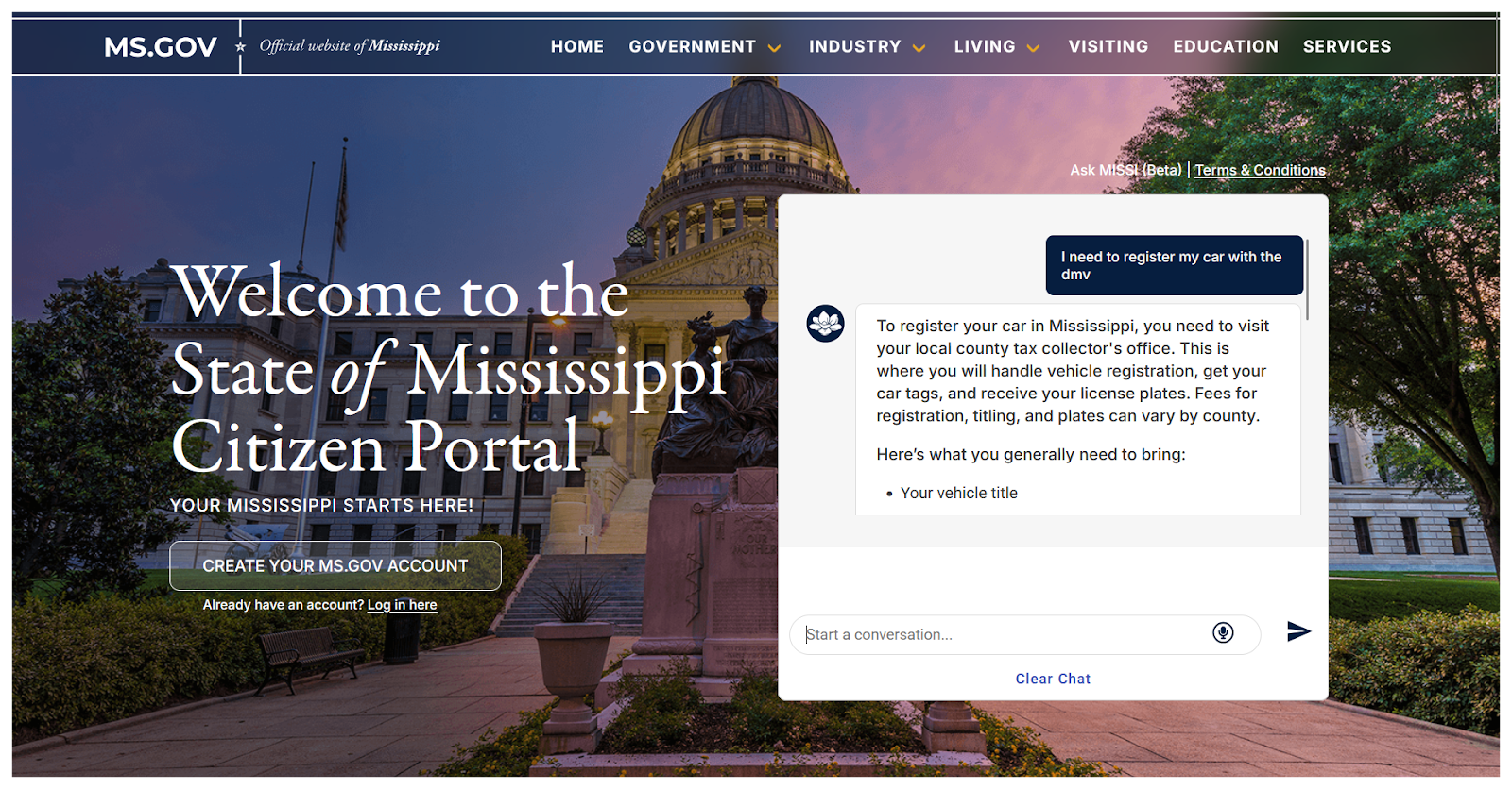 There are so many reasons to expect a government website chatbot to provide a subpar experience. MISSI exceeds not only those expectations but also those of a chatbot from a private company. The welcome message and website information are careful to stress the beta status and current limitations of the experience, while still providing some of the most comprehensive answers that we saw from a chatbot.