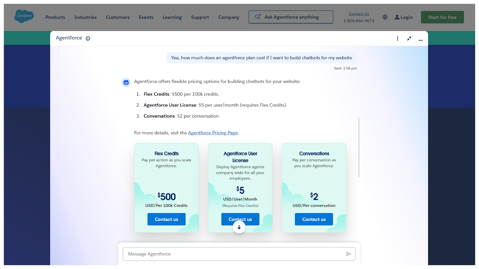 Creating an assistant as visually appealing as Agentforce with Salesforce’s chatbot builder would be an expensive and time-consuming affair. So although their builder didn’t make it on the first half of our list, their live chatbot did. Agentforce lives in the main navigation, rather than a button in the bottom right corner of the website. And when you open it, it’s a large, centered window that slides out from the bottom of the screen. At the end of the day, it mostly offers the same experience as other bots, but with just enough of its own style to be memorable and interesting.