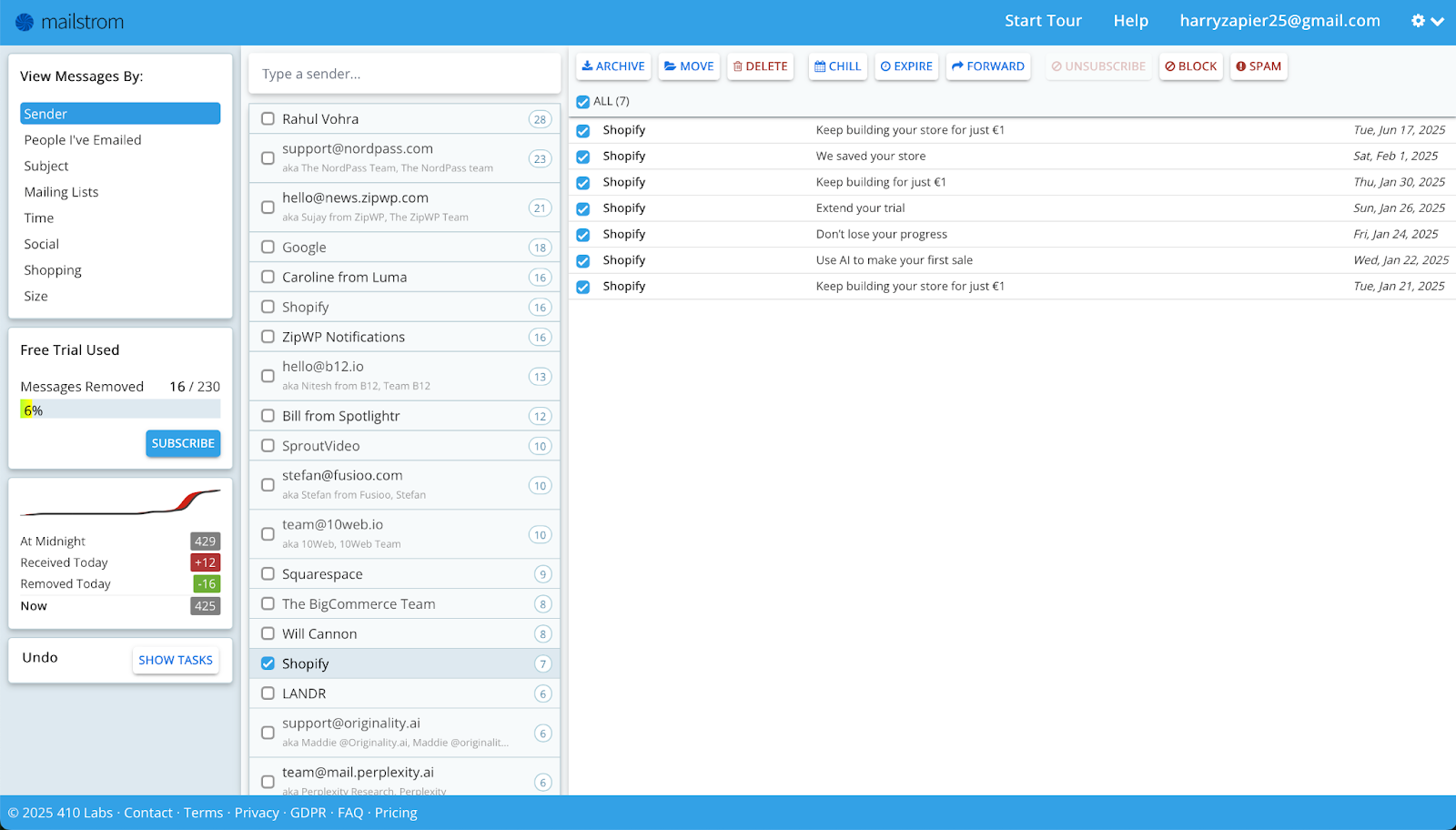 Key features: Mailstrom gives you a big-picture view of your current inbox mess. It can create rules to sort existing and future emails, use the “Expire” function to wait a few days or a week before deleting emails so you can see them but they don’t clog up your inbox.