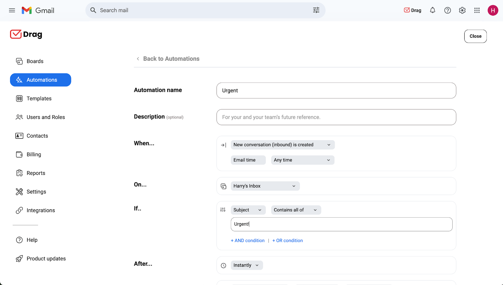 Drag’s sorting features are solid. It uses automation rules to automatically tag your emails, send stock replies, move messages around your inbox, and more, based on dozens of different triggers. For example, you can automatically find all support emails that haven’t been replied to in 24 hours and flag them for urgent follow-up.