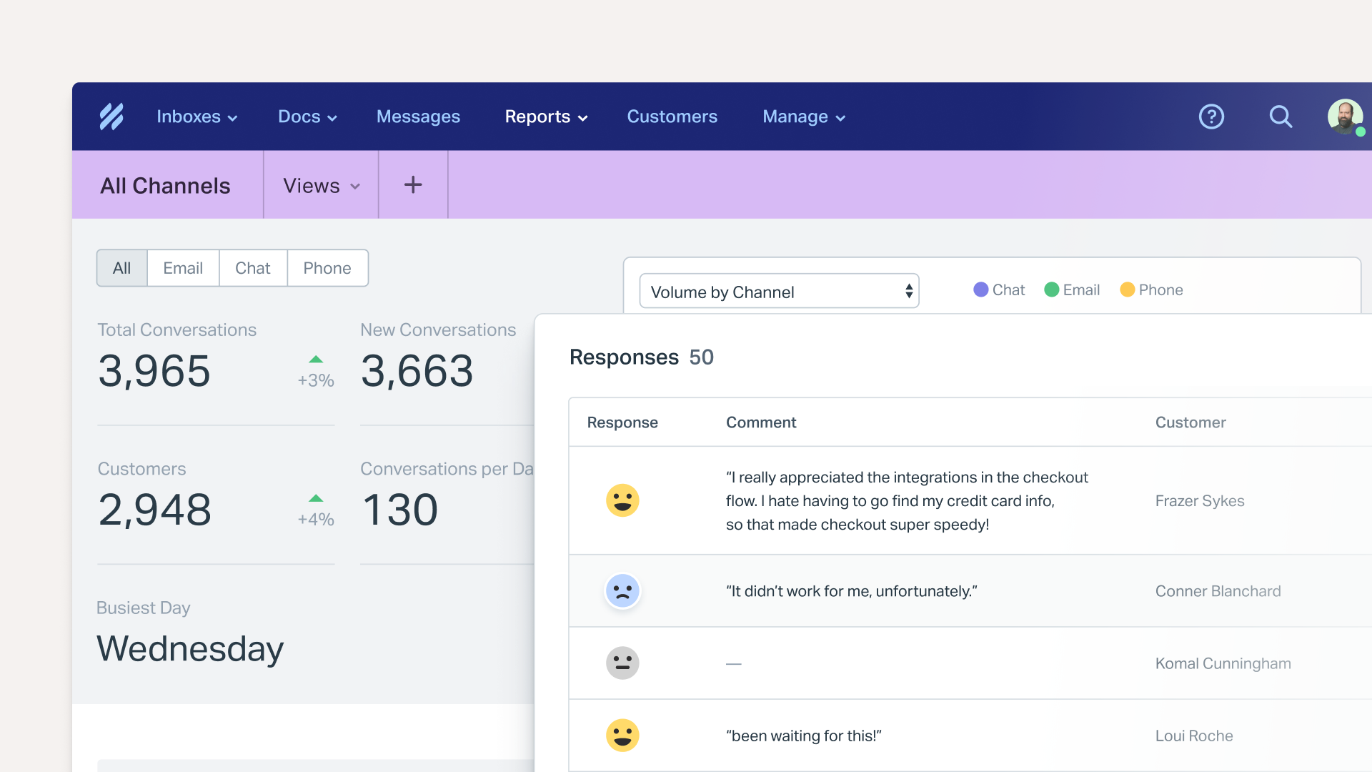 - Reporting dashboards showing response times, CSAT, and individual performance