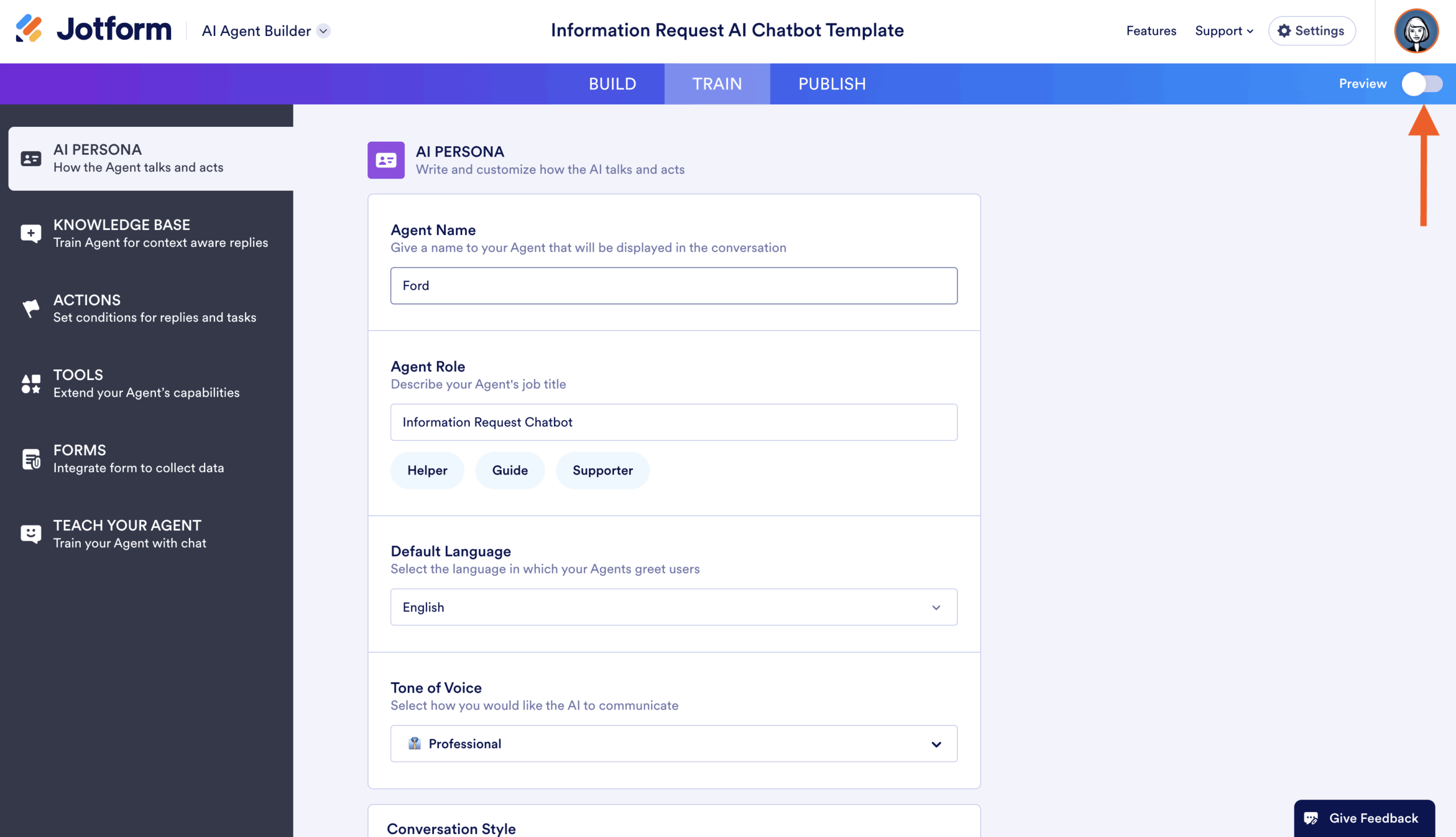 2. Toggle the Preview button on the top right-hand corner of the chatbot builder: Now, you’re in testing mode.