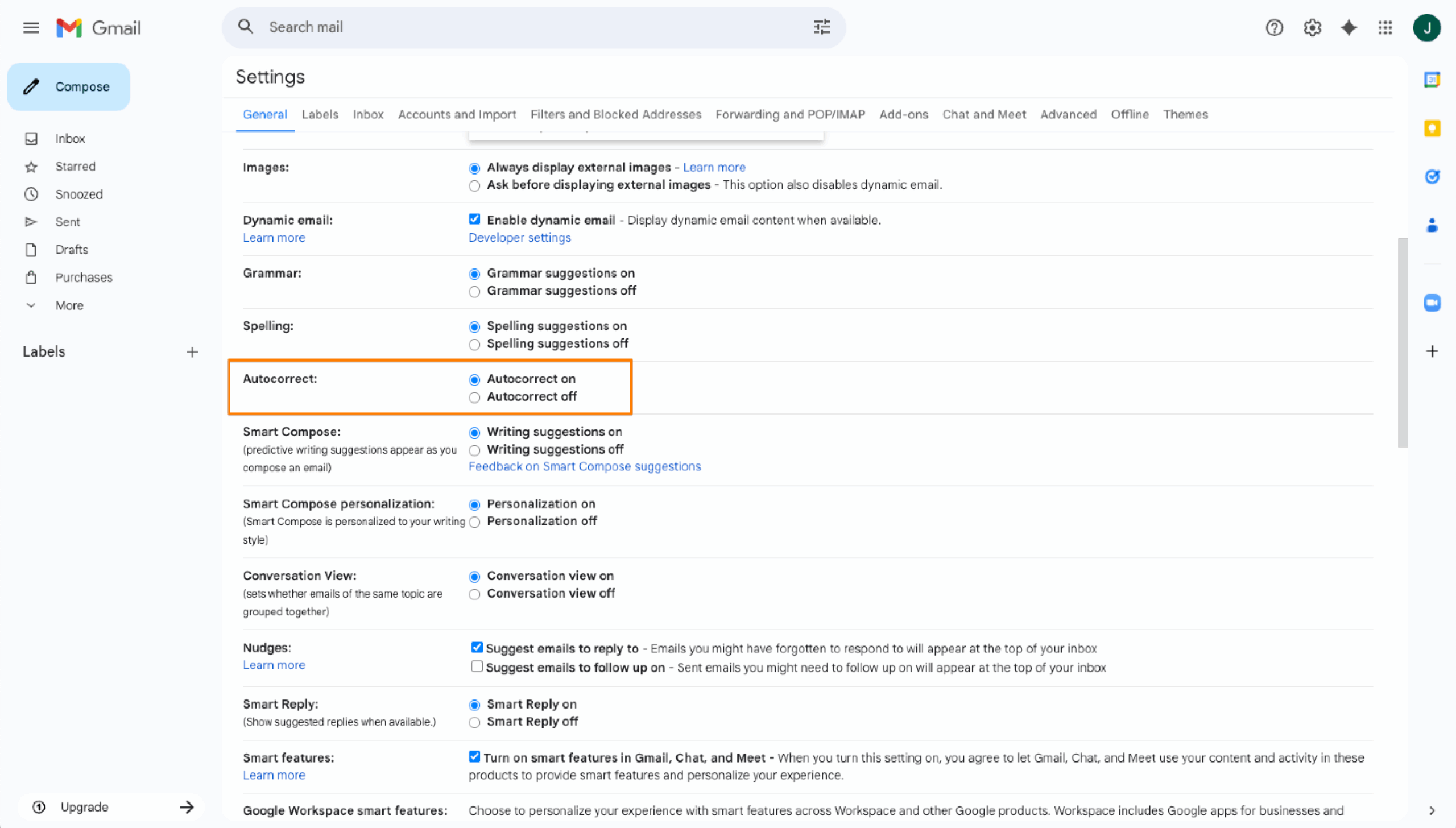 - Click on the General tab, and scroll down to the Smart Compose section.