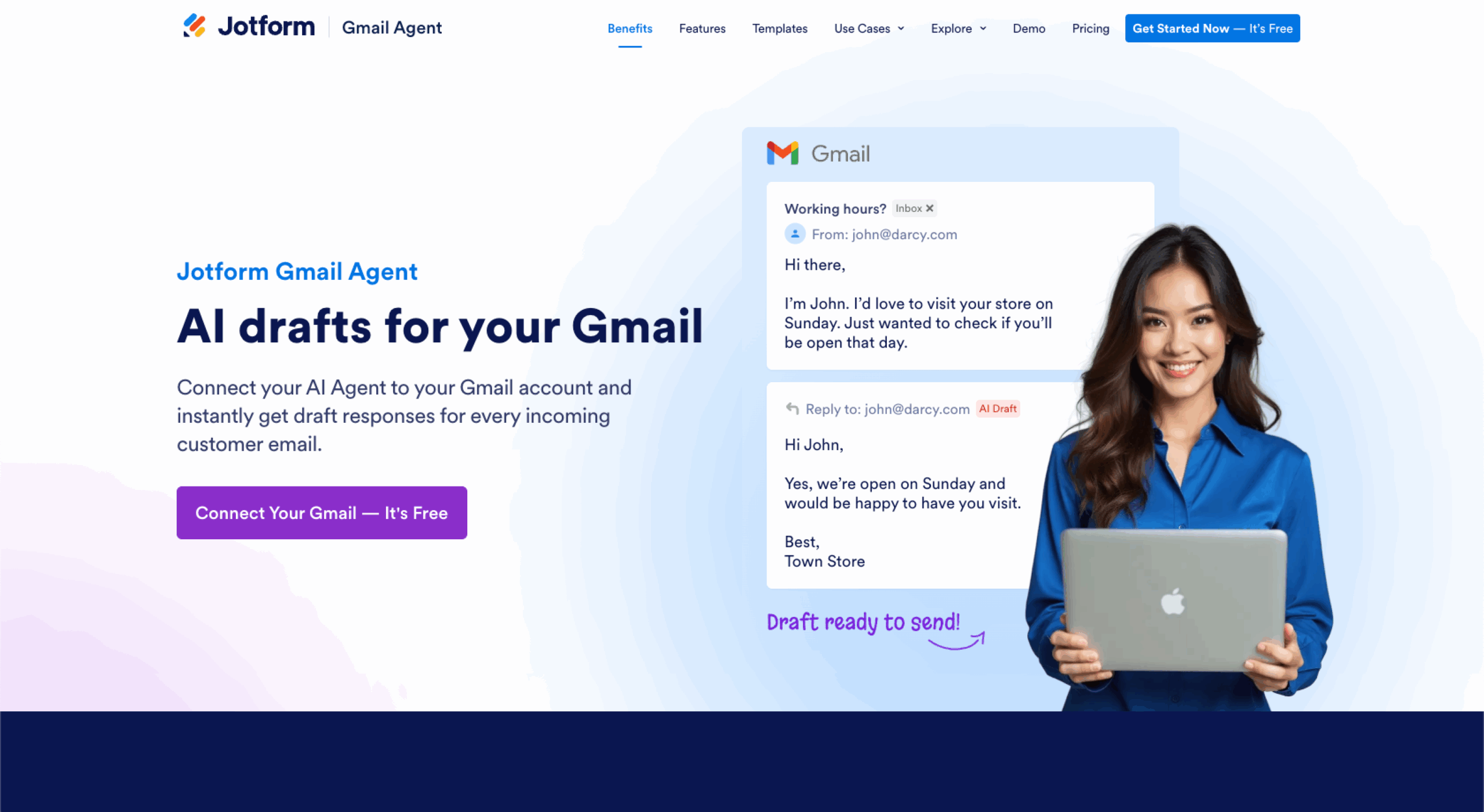 Gmail’s AI features integrate seamlessly with specialized tools like Jotform Gmail Agent, which generates draft replies for your incoming emails. While Gmail’s basic Smart Reply suggestions offer only brief suggested responses, Jotform Gmail Agent creates draft replies based on your past conversations, FAQs, and brand tone. This lowers your response time significantly and increases efficiency.