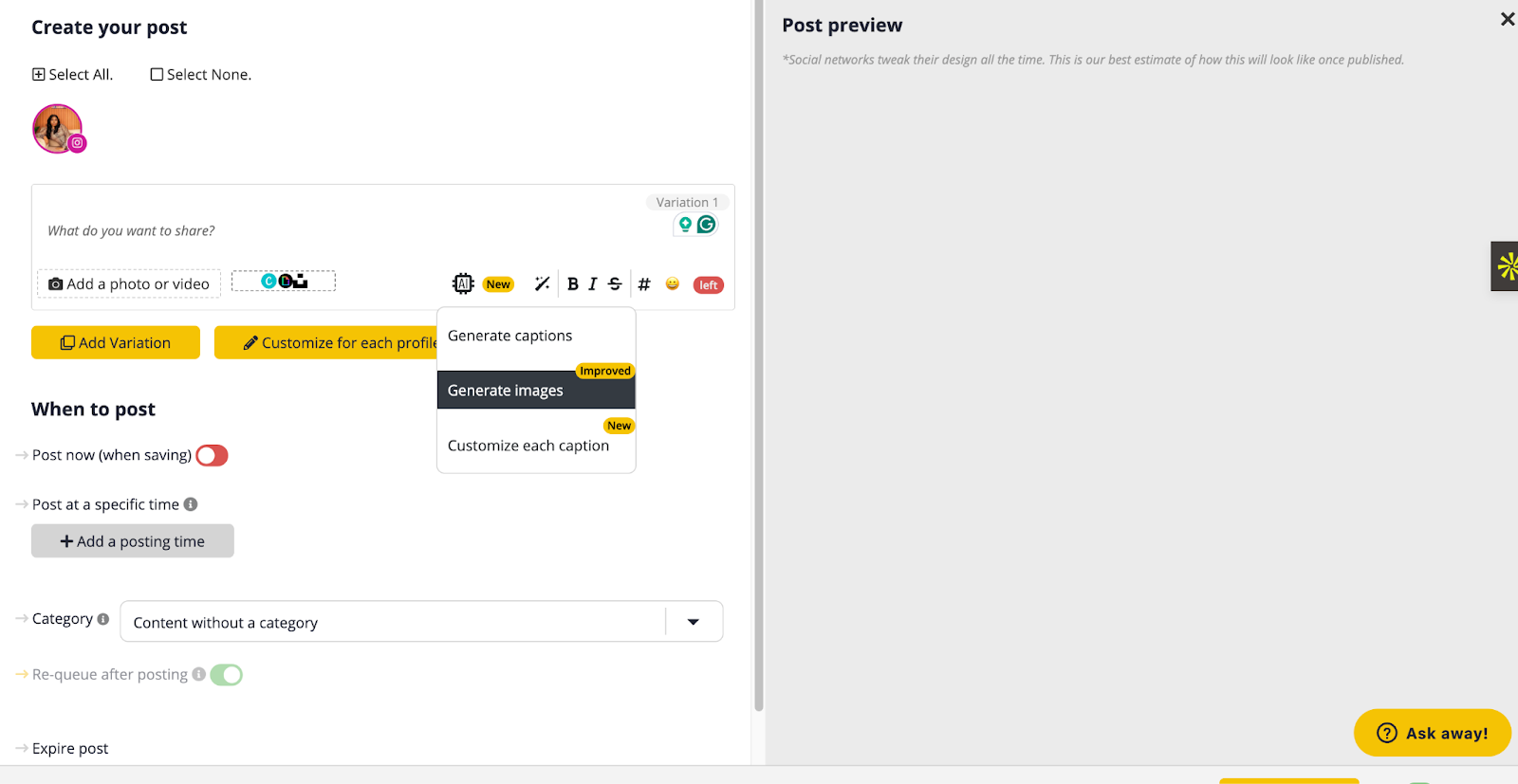 With SocialBee, you can plan and publish single images, videos, carousels, Stories, and Reels directly on Instagram. Within the composer, the AI suggests captions, generates hashtags, and even builds posts from prompts. Its content recycling tool allows you to categorize and automatically reshare evergreen content, making it easy to maintain a consistent online presence. You can organize posts in categories, use the grid preview to see how posts will look on your Instagram feed, and manage comments, mentions, and DMs from inside your SocialBee dashboard.