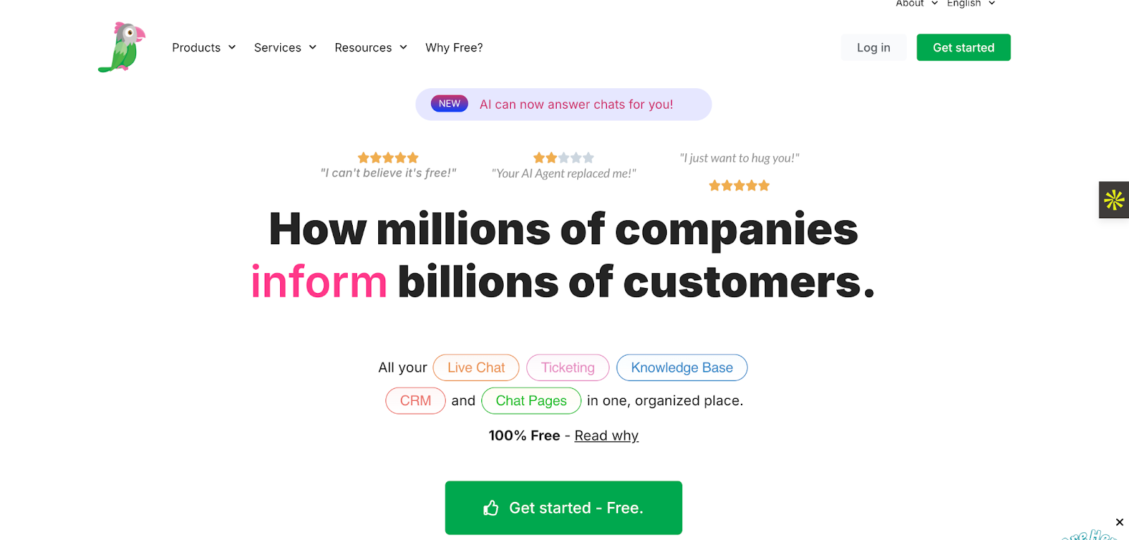 | Standout feature | AI-first live chat widget | Automated sales flows | Live widget loads under 2.5 seconds | Built-in video game to engage visitors and reduce bounce rate | Integrates natively with the Freshworks ecosystem | Highly proactive engagement | Robust ticketing and workflow engine | Messaging across local channels | 100 percent free core product | Built-in lead qualification |
