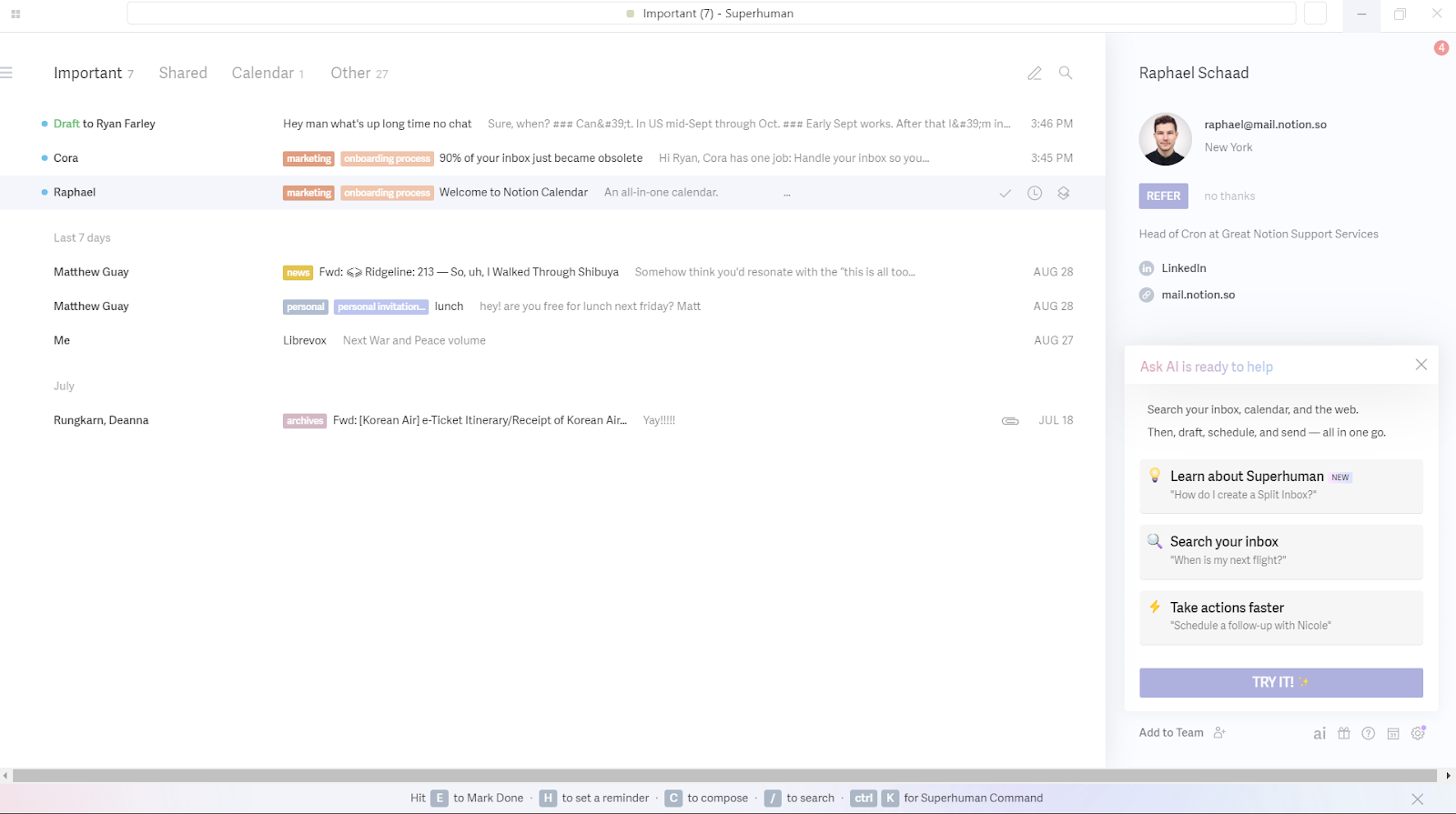 On the AI front, Superhuman’s features strike a nice balance between being helpful without dominating the interface or command palette. You can either highlight text and click the “ai” button for suggested edits and paraphrasing or open the chatbot sidebar from the lower left corner of the screen. Other than that, AI works mostly in the background.