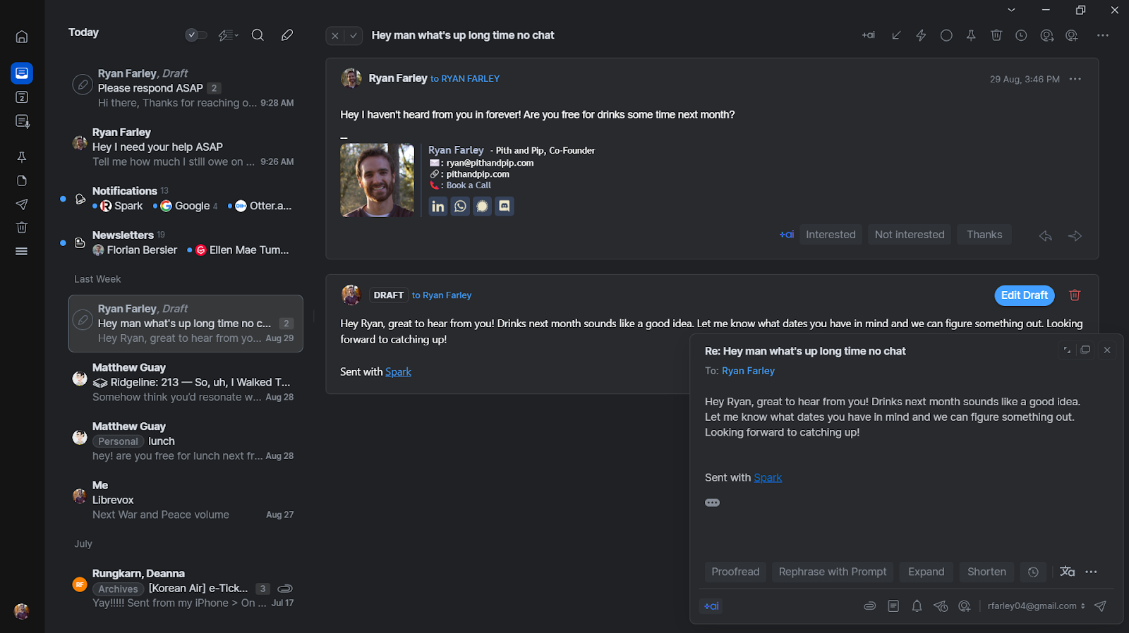 Signing up for a Spark paid plan, however, unlocks a handful of AI features that we found to be a nice balance of useful and minimal. Open an email, for example, and you’ll see a few categories of responses (Interested, Not Interested, Thanks, and so on). The first time you click one of them, Spark will spend a few minutes looking at your Sent folder, then write a quick reply based on your style and the category of response you selected. From there you can ask AI to expand or shorten the draft, change the tone, or rephrase based on additional information you provide.