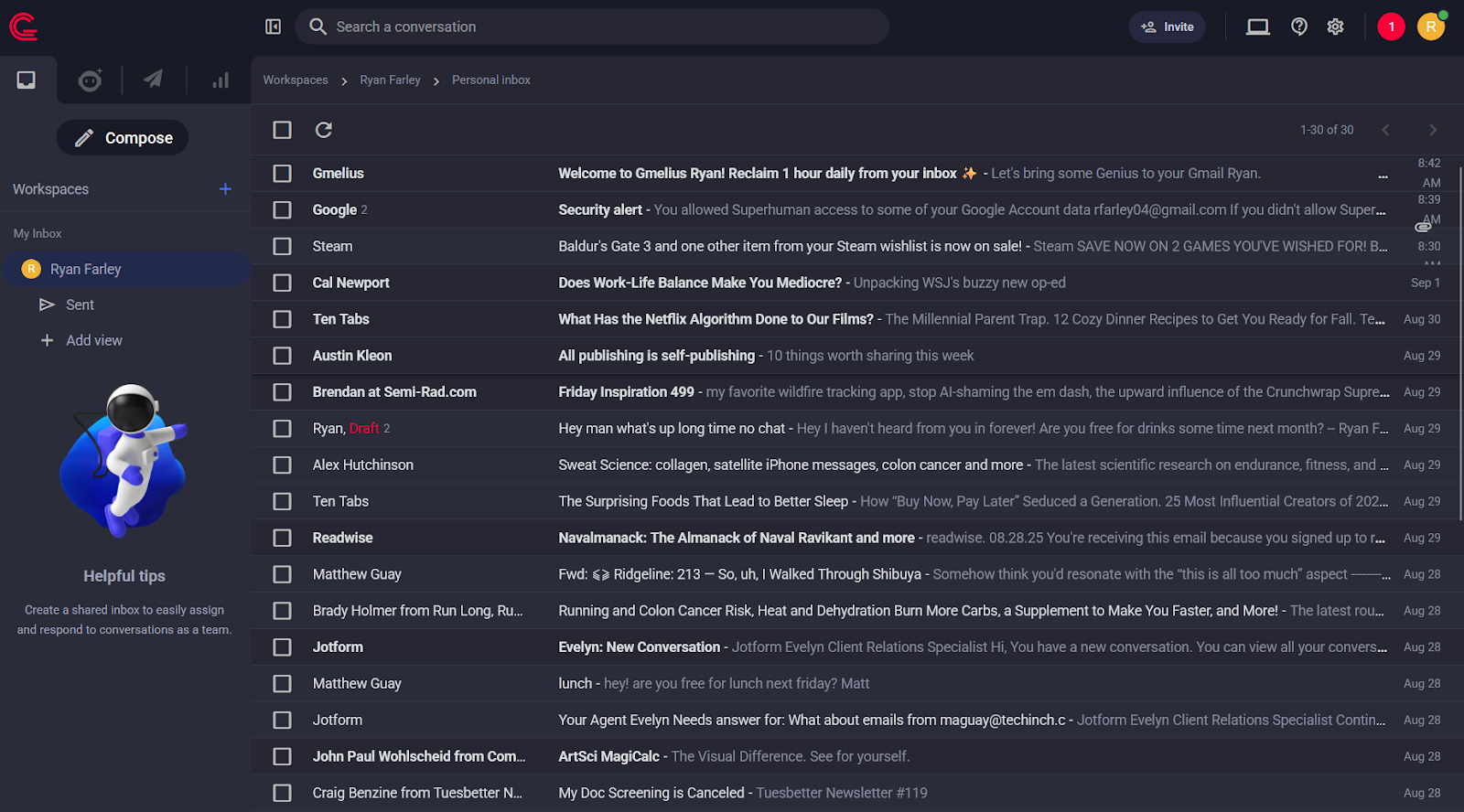 One ding against Superhuman (other than its high price point) is that there is no web app. You cannot access your inbox from a browser tab and will instead have to download the desktop app. Once installed, it guides you through a somewhat lengthy onboarding that teaches you how to reach inbox zero using only the keyboard. It can take a minute to get used to, but it does feel smooth and snappy once you get the hang of it.