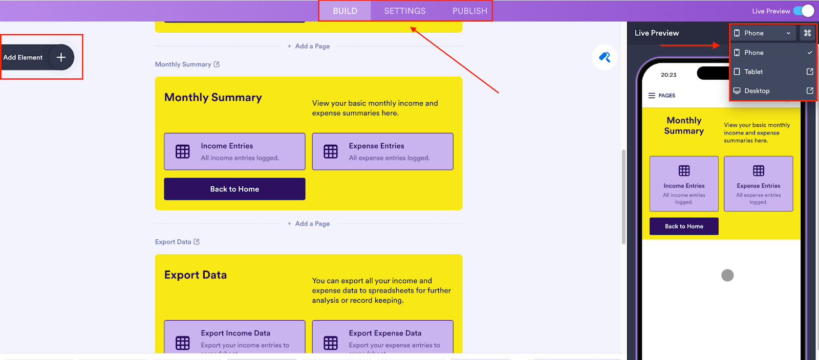 - In Build: You design your app, add elements, customize layout, and preview it live on mobile, tablet, or desktop.