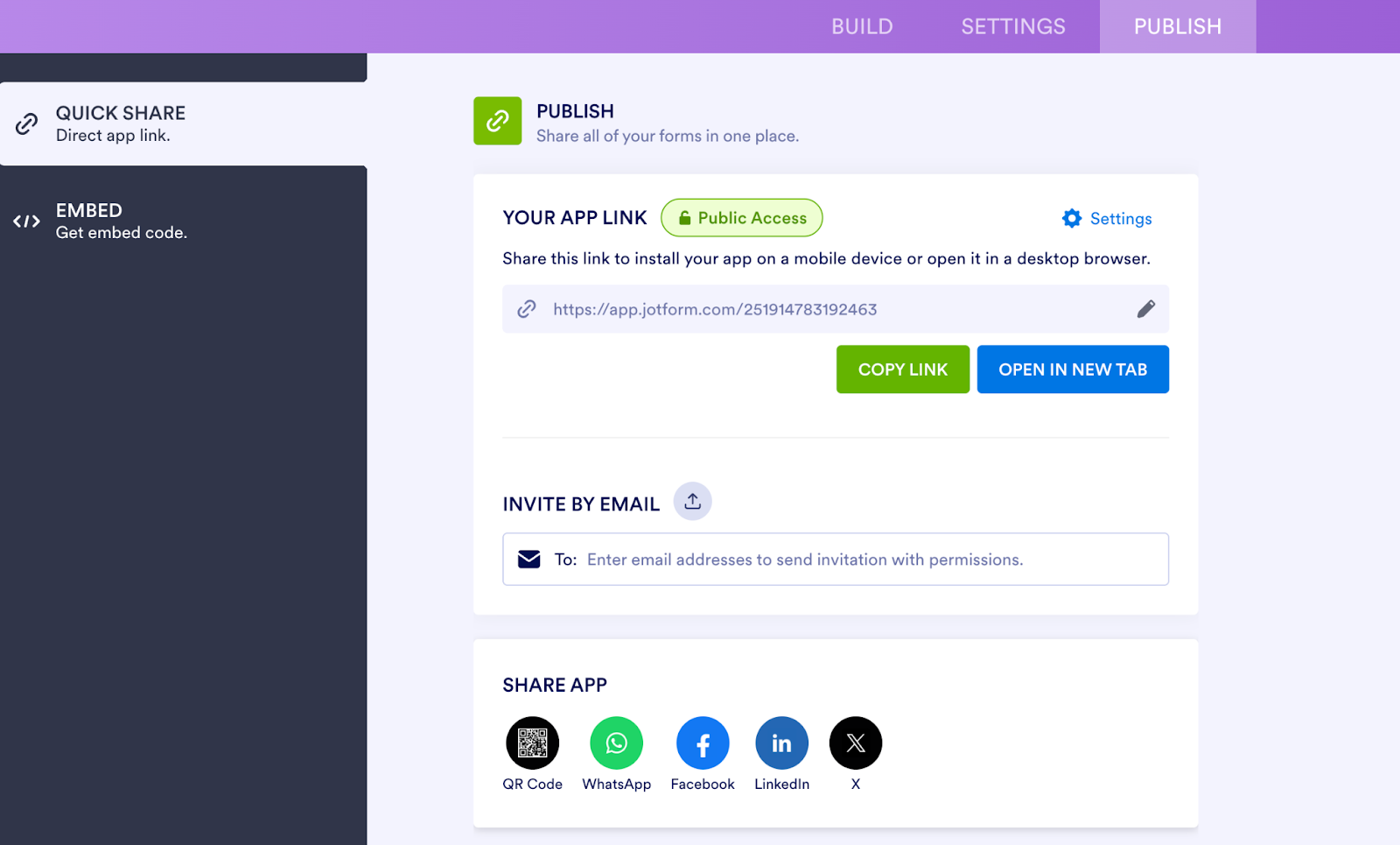 - Flexible app designer: Multipage apps, custom URLs, sharing options (email link, QR, embed).