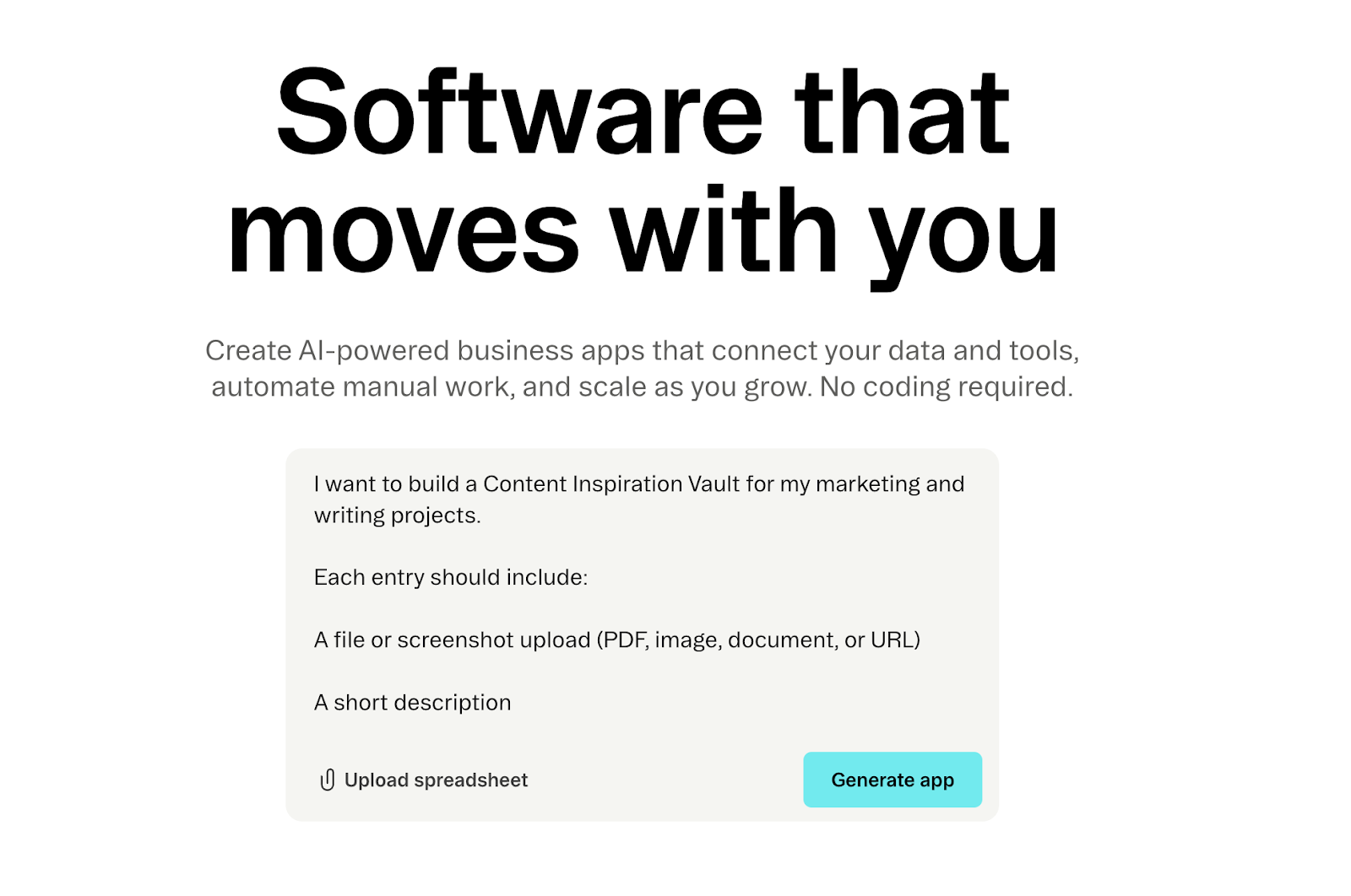 - You can’t publish to the App Store or Google Play directly yet. Apps are accessed through links, QR codes, or embeds, which is fine for internal use but might feel limiting for customer-facing products.