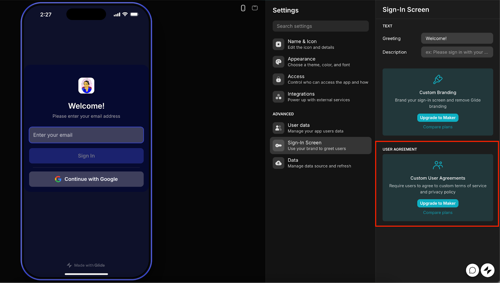 You can also configure your sign-in screen, complete with a greeting, brand customization (on paid plans), and even custom terms and policies users must agree to — a feature I wasn’t expecting in a no-code AI app builder at this level.