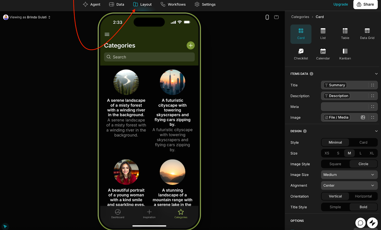 Customization-wise, Glide hits a sweet spot. Everything I need to tweak, such as fonts, image styles, card sizes, orientation, is right there in a clean, intuitive panel. In this case, I’ve chosen a minimal card layout for the “Categories” page, with round images, centered text, and bold titles. The live mobile preview updates instantly, so I can experiment freely and see exactly how each change looks on a real screen.