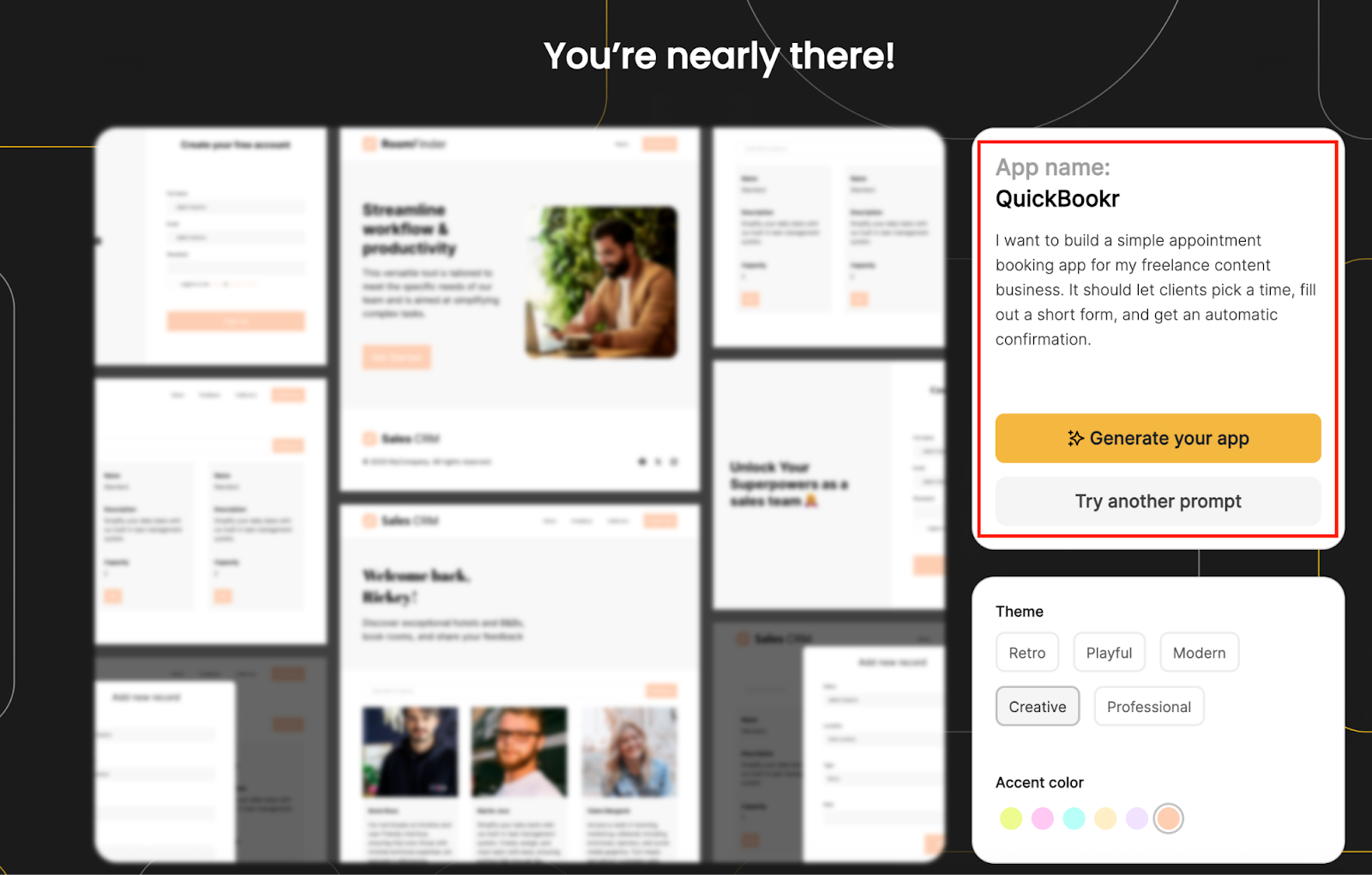 That said, it’s a nice touch that you can input your app name up front, choose a theme, and even pick a color before you hit “Generate your app.” You also get the option to tweak your prompt if you’re not happy with it.