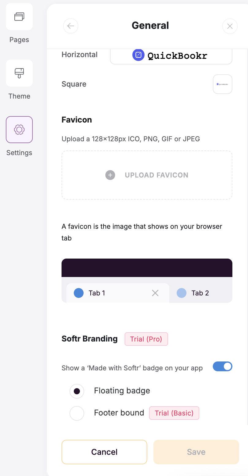 You can upload a custom favicon (that tiny browser tab icon that makes everything feel a little more polished). And if you’re fussy about white-labeling, you’ll notice the “Made with Softr” badge is on by default. You can switch between a floating badge or a footer-bound one, but removing it entirely is gated behind the Pro plan.