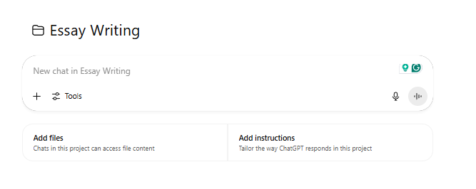 The following screenshot image shows what a new project titled “Essay Writing” looks like: