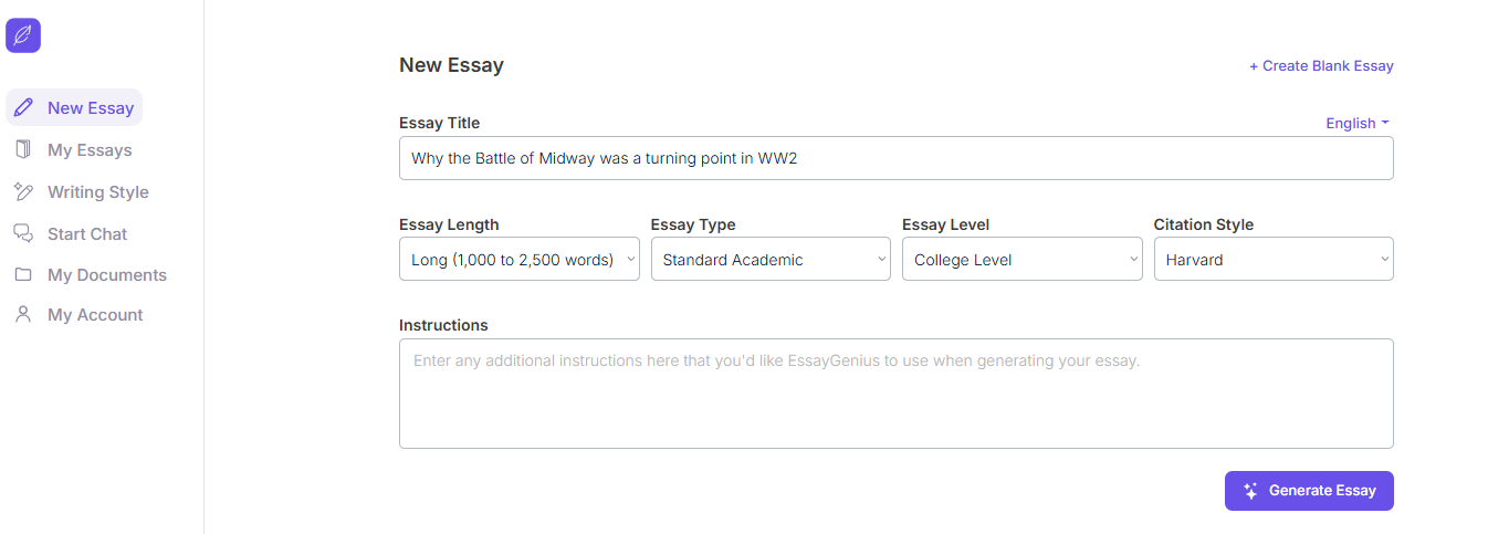 EssayGenius is an essay writing AI tool that will generate articles very quickly. Using filters and free-text instructions, you can prompt the AI to create your desired essay.
