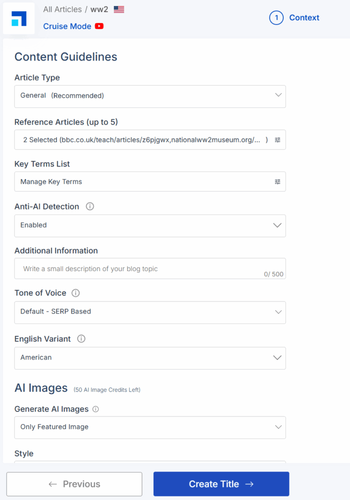 - Cruise Mode is a key feature for many and the reason why this tool is best for rapid draft generation. Cruise Mode powers through the content process — from keyword research to full draft — in guided stages. I didn’t want to include this feature as a con since others praise it, but I found the mode a bit too fast. I prefer to prompt the AI tools to produce better results.