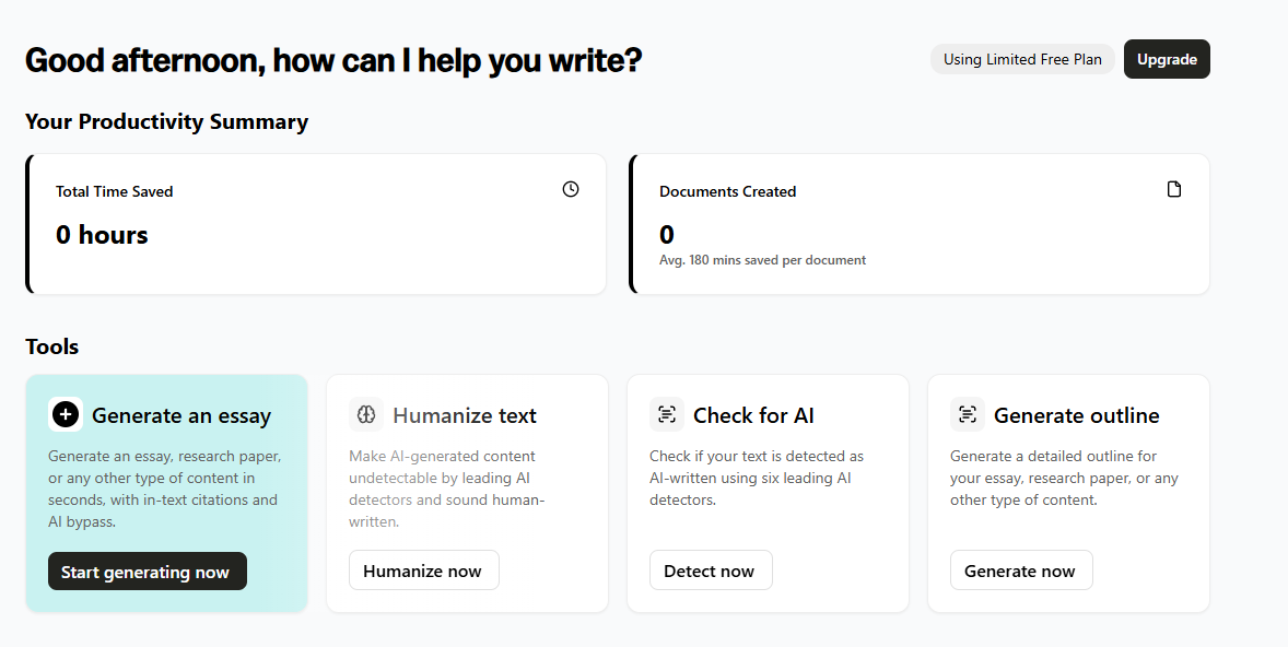 Best for: academic essay generation, research writing with citations, and AI-powered tutoring