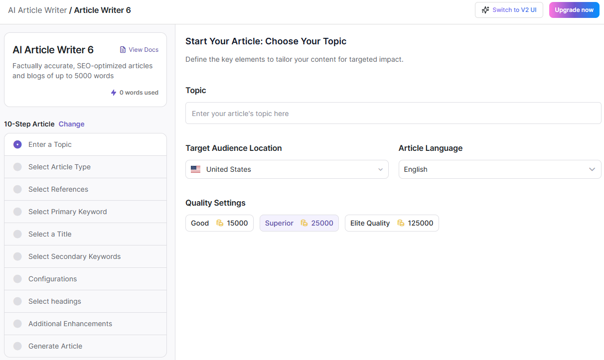 Here’s what the screen looked like when I started a 10-step article using Writesonic’s AI Article Writer tool: