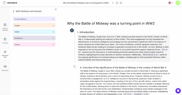 The following image shows the Samwell.ai interface after it generated an article about the Battle of Midway for me. The user experience (UX) was really nice. I just selected a paragraph I wanted to edit, then on the left, chose how I wanted to edit it. I liked how easy it was to iterate on content.